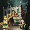 A bare-footed man sits on a barrel, eyes downcast, a straw boater on his head. A woman in garish green looks impassively towards the front. Behind them, a painted backdrop of an austere Victorian building is coming loose from its support, revealing a blank black door. Cold white light falls from above and to the right. As viewers, we recognise each element but struggle to make a coherent narrative.