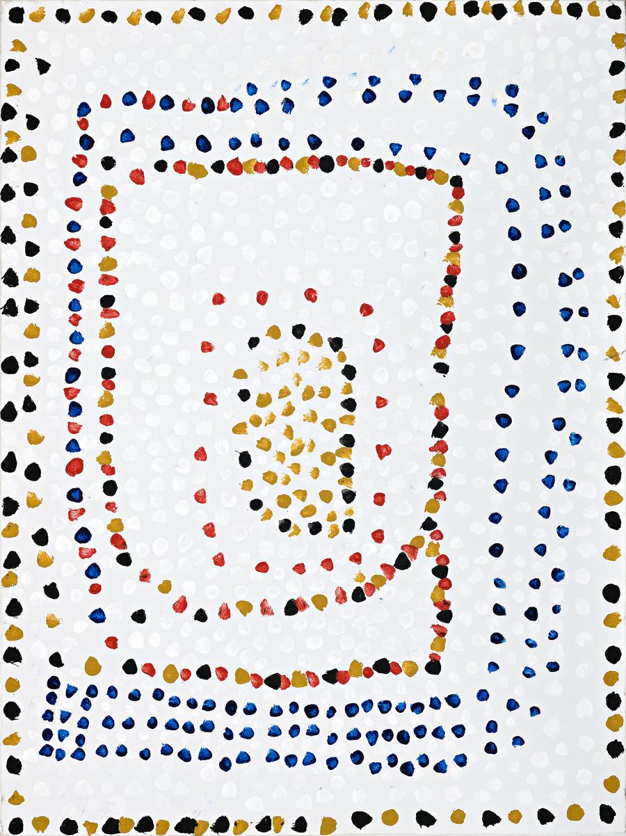 'In taking up painting in 1995, Prince found a medium through which he could retain the essence of his active ceremonial life. His paintings have a musicality imparted by the lively staccato-effect of the dots and intermittent bars, as if to read like sheet music for an improvised symphony. Prince's uninhibited use of colour belies the origins of these designs which were passed on by his ancestors as marks on the bodies of ceremonial participants.'
