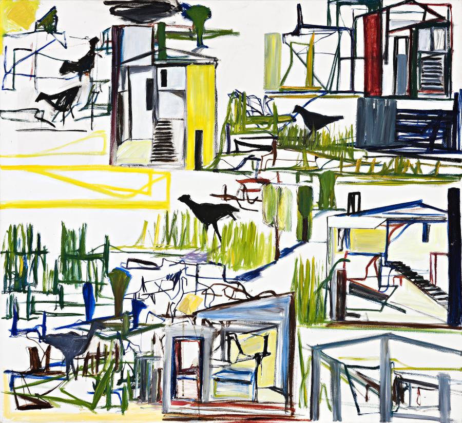 The picture's restrained palette and almost minimalist application of paint suggests a work that has been made rather swiftly. Often, however, Whisson's works are many years in the gestation, especially if one accounts for the time between an image seen, or remembered, through to finally being laid down on the canvas. Multiple painting sessions add to the work's episodic character and each panel could have been made in separate campaigns in which the canvas can be rotated 360 degrees and other motifs added or subtracted. The chooks embedded in the painting's grid-like forms are constant characters that appear with some regularity within Whisson's oeuvre.