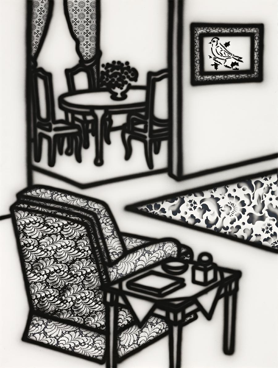 Letter-Box Home, 1995 hails from an extraordinary period in Howard Arkley's career. During the early 1990s large scale works on paper became a passion for the artist. They were a medium with which to explore ideas and new techniques, one of which, seen amply in Letter-Box Home was the use of stencils. Arkley worked assiduously to both avoid repetition in his stenciling and to plot increasingly imaginative ways to 'design' his furnishings, rugs, curtains and other suburban paraphernalia. The intense variations, which recall the more hallucinogenic aspects of his visual language, shift from minimal, as seen on the rug, to the baroque of his lounge chair covering. These are in turn carefully contrasted by the carefully articulated voids of the walls, giving the picture its potent sense of three-dimensionality, allowing us to imagine we could walk into the frame.