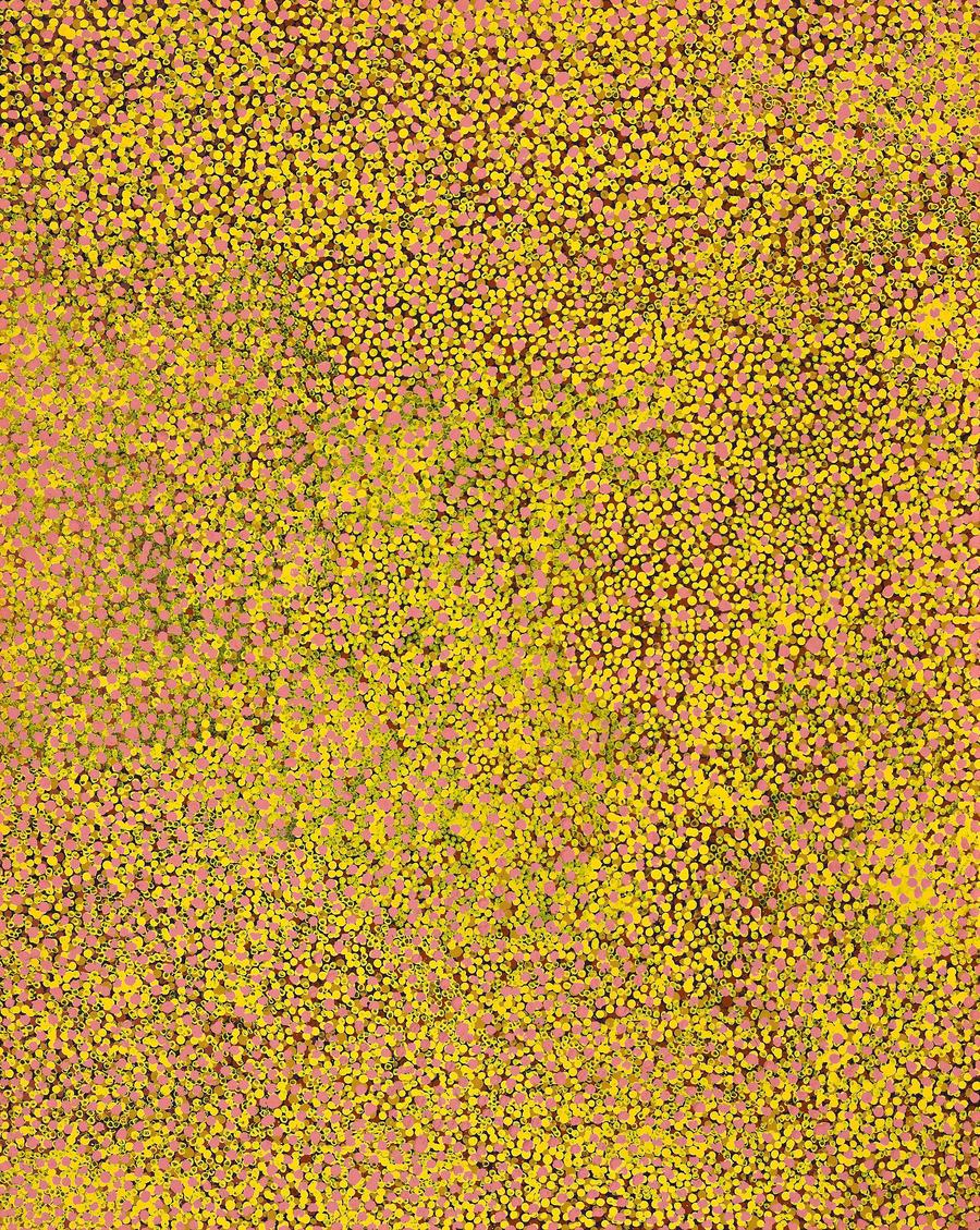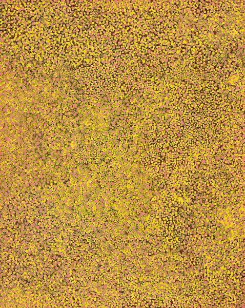 Using an interesting palette and the smaller dot-work as evidenced in all of her earlier works, Emily displays her country in bold and brazen storms of colour. Each colour represents the raw, ripe and dry fruit, the bud the flower, the dry petals, the plant stem, the stalk, the scattered seeds - all parts of the life cycle. This is one of the several canvases completed when the rain was building up. Emily was unusually calm, and ceremonial activities were on hold. This work is in anticipation of the transition from barren to lush.'
