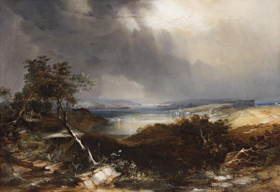 Storm over North Head, 1856 is a particularly fine example of this oeuvre in Martens' artistic production with its wide sweep over Sydney Harbour from the heights of Vaucluse across to Manly Cove in the distance, and to the right North and South Heads and the semi-circle of Watsons Bay, with ships taking shelter from the storm. In a series of brilliant theatrical touches, Martens has illuminated the road to South Head past the Macquarie Lighthouse as a counterpoint on the far right which in turn offsets the main central focal point of sunlight on the water. Moving to the foreground, the sun's rays catch the sandstone rock and tree trunk angled like punctuation points as an immediate visual focus. This is further emphasised in the bravura compositional effects of parallel diagonals formed by the line of looming storm clouds moving through the centre of the image and echoed by the tree highlighted in the left foreground.