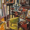 In her seminal publication on the artist, Heather Johnson selected Studio Interior for an extended analysis, noting'easels, canvasses, furniture and objects are compressed physically and as well visually flattened into the almost non-existent space of the paint surface. [The elements] retain a harmony - achieved by the repetition of the vertical lines and rectangular shapes of the frames, easels and furniture legs- and a complete readability. De Maistre has drawn on his knowledge of Cubism to show the relationship between space and form, but has not treated the forms as individual objects, each fractured into its own planes and surfaces. He has instead treated the corner of the studio as a complete object/form in itself 'a doorway in the background is flattened against the table and chairs, in turn joined in a homogenous whole to the easel, the yellow armchair and book-table. The study of penetration of space into this form is as analytical as the analytic cubist works of Picasso and Braque.'3