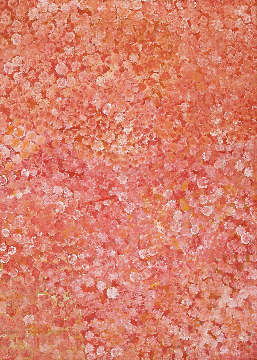 Emily Kngwarreye's mark making and abstract references to ceremonial practice identifies the relationship between individual, country, ceremony and ancestors. Ceremony, as expressed through narrative dance and body decoration reinforces knowledge about staples, such as bush foods and water sources, as well as teaching basic social codes and obligations. Through her paintings such as Untitled, 1993, Kngwarreye passed on her knowledge to those who follow her. Untitled, 1993 can be perceived as a romantic mapping of country, an expressive record of the desert in bloom and more simply from an outsiders view, as an striking abstract painting.