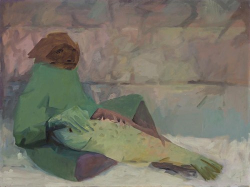 The cod's resignation to its fate is evident through its expression, which in a gesture brings Fullbrook's sense of humour to the work. The work is painted in his typical way with broad minimal brush strokes delivering the paint. Crash or crash through is the aim, hit and miss the method. Despite this cavalier approach, the results are surprisingly delicate with tender harmonies of high key colour that are calligraphic and spontaneous in nature.