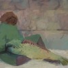 The scene depicted in Woman with Cod is serene. The fish, destined for the fire, rests on the old woman's lap. Her hands holding the fish appear to caress it, the image showing the compassion and respect that the woman has for the creature. The cod is food and the woman is'singing the fish'. The old woman sees creatures as whole; one fish is'all fish', the respect shown at this point ensures the fish will continue to provide food for the woman's family. Fullbrook's understanding of, and empathy for Aboriginal people was profound. Working side by side with Aboriginal stockmen during the late 1930s he was shocked by the social injustice he witnessed, and this affected him deeply.