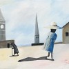 Occupying a realm between dream and reality, Blackman's Schoolgirls present a myriad of emotional states and entities - from vulnerable and self-absorbed to dangerously clumsy, haunting and even predatory. In the present work, the pervading mood is one of unnerving disquiet - heightened not only by the scale discrepancy between the figure and her surrounds, but by the enigmatic, de Chiricoesque shadows and silhouettes, and oblique linearity of pavement and horizon. Imbued with the same soft grey and pastel pink and blue palette as There Was, 1953 (a related composition featuring the iconic clock tower of the Hawthorn town hall), indeed this sense of vulnerability is rendered all the more poignant by the conjunction of the innocent young girl with the dark profile of an older woman with a cane - emblematic of passing time, but also perhaps, of Barbara's failing vision at the time.