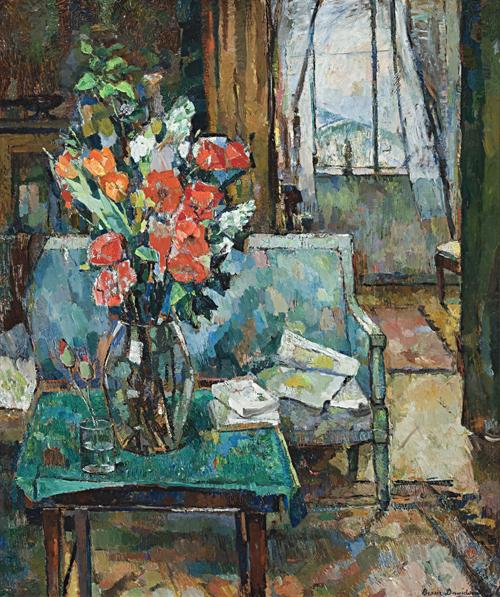 Adelaide-born Bessie Davidson spent most of her creative life in Paris, absorbing the elegance and sophistication which we associate with the French capital and manifesting it in her art. It touches her landscapes, and especially the interiors and still life paintings in which she excels- Interior with Poppies being a classic example. Her excellence in this genre was, no doubt, influenced by her earlier association with Margaret Preston (then Rose McPherson), in whose studio she studied from 1899 to 1904. Together, they travelled abroad, Davidson continuing her studies at the Munich Künstlerinner Verein, and in Paris at the Académie de la Grande Chaumière. Although Davidson returned to Adelaide in 1906 and taught for a number of years with Preston, her home became Paris where, from 1910 until her death, her studio was in Rue Boissonade, Montparnasse.