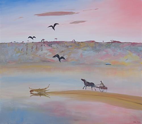 Indelibly influenced by these events which left the artist and his family marooned, Boyd subsequently embarked upon a series of landscapes so redolent with pending disaster - 'it is as if Nature is holding its breath.'4 Drawing upon the motif of the horse-and-jinker first employed in his poetic tribute to his mother, Potter's Wife, Horse and Trap (Rosebud), 1969-70, the artist thus explored through various compositions the theme of the lone rider venturing across a watery landscape presided over by the menacing black crows of death. In Black Horse, 1975, for example, the horse stumbles uncertainly towards the water, while in Jinker on Sandbank, 1976-77, fear has transformed the rider into a hare, and in Figure Driving Beneath Pulpit Rock, 1976, the horse has been completely replaced by a pair of swans which imbue the work with a surreal, almost disquieting sense of calm.