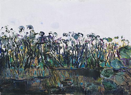 The 1970s introduced some of Fred Williams' pictorially richest and most interesting works, as seen in Landscape with Swamp. From the aerial viewpoint and minimalism of the You Yang paintings and the tripartite divisions of his later Lysterfield paintings, his work gave way to the freer compositions and richer colours of the Yan Yean oils of 1972, painted out of doors at the Yan Yean Swamp in company with John Perceval. Unlike earlier works, they are clearly identified with the place and its particularities, being described by Patrick McCaughey as 'among the finest and most interesting of all the oil sketches of the early 1970s.'1 Although inspired by a different place, Landscape with Swamp belongs to this group in terms of motif and achievement. Now more traditional in pictorial presentation, the brilliance of palette and vitality of form gains in emphasis through the use of black, outlining tree trunks and water's edge. It provides an element of control, as it were, for the rich tangle of colour and paint, seen again in such works as Yan Yean II (Dog Chasing Possum) and Yan Yean in the collection of the Queensland Art Gallery, both painted in 1972.