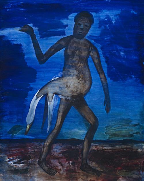 The ancient greek myth of Leda and her swan exists in several versions. In its simplest form, the god Zeus transforms himself into a swan and couples with the Aeolian princess, wife of the King of Sparta. She subsequently lays an egg from which hatch Polydeuces and Helen of Troy. The divine visitation - which culminated of course in the Trojan War - has been a powerful image through the ages. Nolan, however, was scarcely interested in the story; and owes nothing to versions by Leonardo, Michelangelo, Tintoretto, Correggio etc. Indeed, his stimulus was essentially poetry rather than painted imagery.
