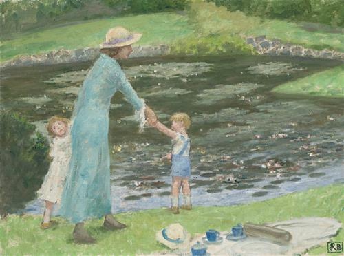 In October 1932 Rupert Bunny returned to Melbourne to find a home where he and his wife Jeanne-Heloise could settle. He exhibited with the Victorian Artists' Society and Twenty Melbourne Painters and turned to painting landscapes within easy reach of where he was living in South Yarra - the Melbourne Royal Botanic Gardens, Albert Park and Toorak. The most numerous were the Gardens, which would have recalled for him those civilised moments of elegantly costumed Parisians in the Luxembourg Gardens where he had painted in the spring of 1909. The Botanic Gardens paintings of the spring and summer of 1932 into 1933 were based on a number of pencil sketches and studies in oil painted out-of-doors, directly from the motif. In the Gardens provides a typical example of the oil sketch. The group unpacking a picnic basket is painted with a vivacity that captures the artist's spontaneous response to the moment. Back in his studio, Bunny painted larger, more finished versions from the sketches in oil, The Lily Pond continuing the picnic theme. Again, the lively handling of paint gives the work a freshness, as the mother and her two children prepare to enjoy the pleasures offered by the peaceful seclusion. It is a characteristic Bunny painting of the time, featuring favourite colours of pale blue and touches of pink in the flowers of the lilies.