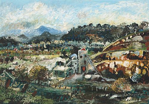 Writing from a more scholarly viewpoint, Smith noted that Perceval's originality sprang from a combination of innovation and experimentation, with influences ranging from the Old Masters such as Pieter Bruegel the Elder to the German Expressionists. 'But his style, for all that, is his own, a style which, despite its apparent abandon and its general freedom of colour reveals a mature mastery of technique and a sure sense of pictorial control.'3 All these virtues are found in Lime Quarry, Lilydale, the panoramic sweep of the landscape characteristically crowded with images rendered in his distinctive virtuoso brushwork. An atmospheric freshness adds to the liveliness and sense of light-hearted fun, as elements of the buildings metamorphose into eyes, noses, and even a red tongue-filled mouth. The quarry itself had further connections with the Melbourne art world, being, among other things, the source of limestone and marble for many of Danila Vassilieff's sculptures (see lots 6, 7, 8, and 9).