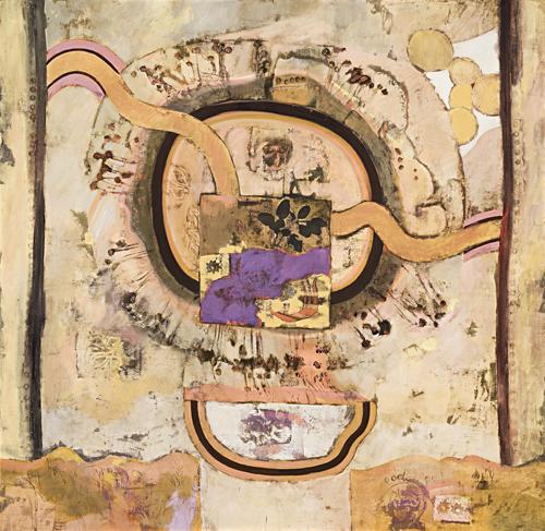 Nanine Landscape had its beginnings in a 1965 trip Juniper made to the old gold-miningd istricts of Western Australia, through Cue, Nanine, Mt Magnet and Carnarvon. Nanine, its name derived from the Aboriginal 'Nannine', lying between Annean Station and Nanine Wells, is a ghost town in the midwest of Western Australia. Its gold rush hey-day belonged to the last decade of the nineteenth century. Visiting these abandoned mining sites inspired Juniper to focus on their landscapes, the gathered detritus being metaphors of the passing of time. In Nanine Landscape and related paintings, he compared the transience of human existence with the timeless grandeur of the landscape. The appeal was also historical, if not archaeological ''I find it a haunting sort of place " these towns which were flourishing early in the century - because the gold has petered out 'and where everything has disappeared but the barest traces... I suppose it's the nearest thing we have in Australia to a vanished civilisation.'1 While this interest in the marks left by human beings distinguishes many of his works, in Nanine Landscape the eye is caught more by the grandeur of the landscape, its sparse vastness contrasted with the detailed beauty of the native flora and fauna - a red kangaroo Aboriginal in form and concept, flowers of traditional European presentation, and Oriental delineation of space. There is an interchange between content and allegorical imagery, and conventional spatial illusions are dispensed with through the employment of the aerial view. The two-dimensional patterns of the landscape are extended by the flatness of the picture plane and the textured surfaces. 'I like my landscapes to look as though they have been exposed to time and the elements like the landscapes they are derived from, hence my use of natural ochres, mineral sands, graphite,'2
