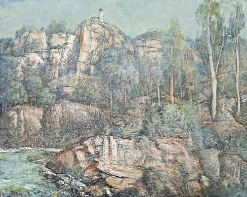 South Coast Façades is quintessentially Lloyd Rees, the projecting foreground rocks and low viewpoint adding to the majesty of the scene, of towering cliffs as ancient as time, and gums noble, tall and straight. It has a wonderful sense of atmosphere and feeling of light, which characterise his best paintings of the sixties. To this is added the richness of the paint, broadly and freely applied, in harmony with the grand manner of his presentation of heroic nature.3 Detailed in imagery and richly textured, the entire surface has been deftly worked with brushes and palette knife.