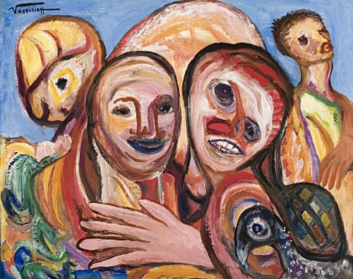 One of a group of figure studies depicting members of the local community which Vassilieff undertook during his time in Mildura and Swan Hill, the present work poignantly reflects the artist's transition from the sophisticated, intellectual milieu of Warrandyte to a relatively commonplace world of day-to-day human contact. Contrasting starkly with his emotionally objective portraits of the thirties and forties, such works may be considered both 'assertions of his presence and gestures of communication'3 - their psychological resonance, rounded expressive forms and swirling scooped lines bearing strong affinities with the art of Norwegian expressionist Edvard Munch. Moreover, with the faces of his protagonists here violently and ludicrously distorted, Swan Hill, c.1955, not only recalls the haptic tendencies of children's art, but alludes to the more aggressive and satirical direction Vassilieff's art would follow as he retaliated against the blindness and stupidity which he perceived in a society insensible to his vision.