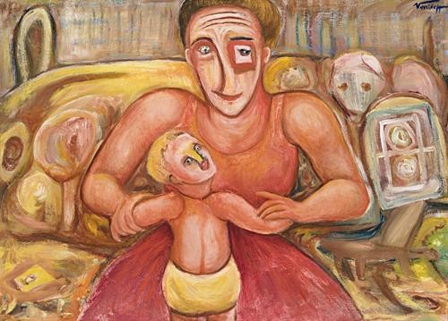 If Woman and Boy similarly echoes the 'Madonna and Child' legacy of Byzantine and early Renaissance art in its rich, jewel-like palette and formality of gesture - the infant (with an adult physiognomy typical of the iconic tradition) embraced by a mother who stares out vacantly at the viewer, her gaze tinged with sadness - it also betrays important affinities with the psychological portraits of the local community which Vassilieff undertook in Swan Hill and Mildura. Indeed, in the same vein as these sometimes disturbing depictions, the present bears an underlying element of disquiet in the starkness of approach, the combination of naturalistic and expressive pictorial means, and particularly, the mother's distraught square left eye. Appearing elsewhere in Mildura Wedding, 1954, - a kind of 'requiem' work exploring the artist's preoccupation with psychological and sexual breakdown in the wake of his own separation from his second wife " and again, in Mildura Mother and Child, the motif seems to allude to the latent uncertainty, conflict and sorrow that pervades the most intimate of relationships.