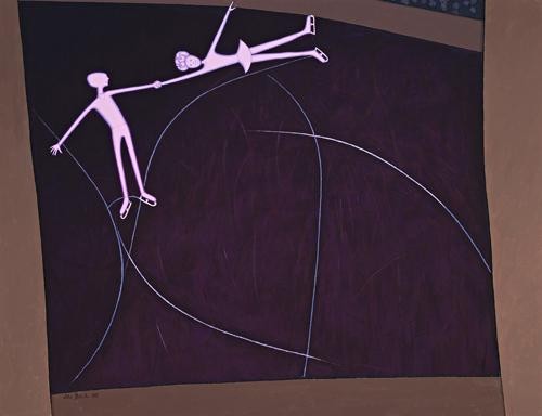 In Up in the Air, 1973 John Brack captures his skaters in an eye-catching but risky move. The painting, however, is much more than mere transcript, abounding with social comment and metaphor. In his earlier skating paintings such as Adagio, 1967 Brack admitted that he had first 'wanted to make a statement about romantic love...', but he had been unable to do so, his sensibilities lying in a far different direction.1 Combining the artificial with the theatrical, he worked through the ballroom dancing series and the contortions of the gymnasts before returning to his ice-skaters with different ideas and intentions. In both versions of Up in the Air and Finale, the figures are faceless, losing their individuality and identity as they become increasingly 'abstract' forms within the composition. Figures no longer dominate their settings, small on the rink symbolic of life, of ice thick or thin on which we skate and leave our marks. Nevertheless, the choreography of skating appealed to him, as did the movements of the ballroom dancers; but he scrutinised and recorded them with a coolly intellectual mind. Ever with an eye for the artificial and the put up facade, he admitted to being 'fascinated by the idea of people who turned pleasure, pastime, into work, labour...'2 Although he was speaking about ballroom dancing, it could be applied equally to gymnastics and ice-skating, the latter with the added edge of greater risk taking. And herein lies the metaphorical references and satire. The surfaces of the ice rink are slippery and full of hidden dangers, a metaphor of the uncertainties of life and how we handle them. Of Up in the Air and the gymnastic Three Pairs, Robert Lindsay wrote, 'Here an added social metaphor exists in the concept of balance, with the protagonists maintaining equilibrium within the contorting complexities of life.3 When Up in the Air was exhibited in Brack’s solo show at Rudy Komon’s, John Henshaw referred to Brack’s return to ‘the gymnasium and the ice palace’, observing that: