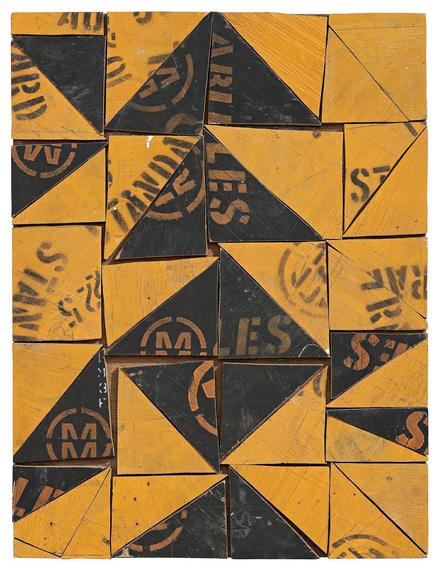 Juxtaposing triangles sawn from wooden industrial cable spools, Pavement II, 1997 is an impressive example of the artist's signature black-on-gold assemblages which first brought Gascoigne widespread acclaim almost a decade earlier with works such as the monumental Monaro, 1989 (Art Gallery of Western Australia). Occupying that space between 'the world, and the world of art',2 these compositions are artful and refined, yet always bear strong affinities with her immediate surroundings, powerfully evoking remembered feelings or memories in relationship to the landscape; '...they are instances of emotion recollected in tranquility' to quote a phrase of Wordsworth's which was so dear to her. In the same vein as the Romantic poets which she so admired, Gascoigne thus aspires to an art that is both 'illusive and allusive'. Here the geometric arrangement with its emphatic frontality, repetition and interest in the formal qualities of colour, texture and movement is unmistakably aligned with high Modernist practice; simultaneously however, the abstraction eloquently echoes tessellated floors familiar to us all (and perhaps originally inspired by the artist's own experience of the celebrated marble pavements of Piazza San Marco, Venice which she had no doubt visited while representing Australia at the Venice Biennale in 1982).