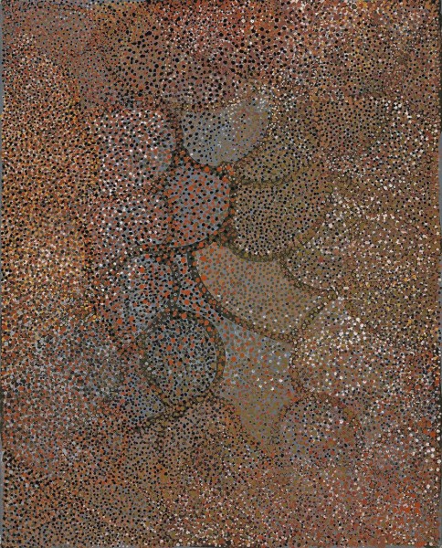 This early painting relates to the dry period of the year when the root of the 'alatji' (yam plant) lays dormant underground waiting to be either harvested or rejuvenated by rain. The dotting represents the desert floor, covered in yam leaves and flowers, as well as the dark ripe fruit of the bush plum - a food favoured by emus, thus making the connection between the artist's Yam Women ancestors and the mythological Emu.