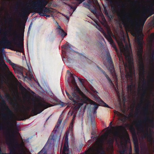 Caught in a moment of intimacy, Maguire's sensuous bloom is in the midst of dropping a single petal whilst the rest of the flower slowly follows. Upon seeing a magnified flower on canvas, one is immediately absorbed by its decorative features, beauty and the life that it embodies. In this work on offer, the flower has reached its zenith and now begins an inevitable demise. 'Maguire recognises that his large flower paintings can be baroque and grotesque, swamped by fleshiness, an overripe eroticism, even morbidity.'1