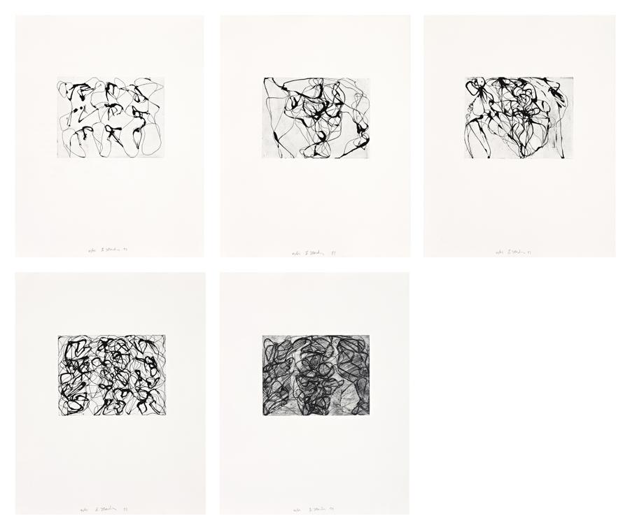 '... drawing's an intimate medium. It's very direct, it's very close. There's less between the artist and the art. There is real closeness, direct contact. A painting is about refinement of image.'2 Etching, despite its technical complexity and physical restraint, encouraged Marden to further develop new directions in his painting - 'things have happened in the etchings that have gone back into the paintings.'3
