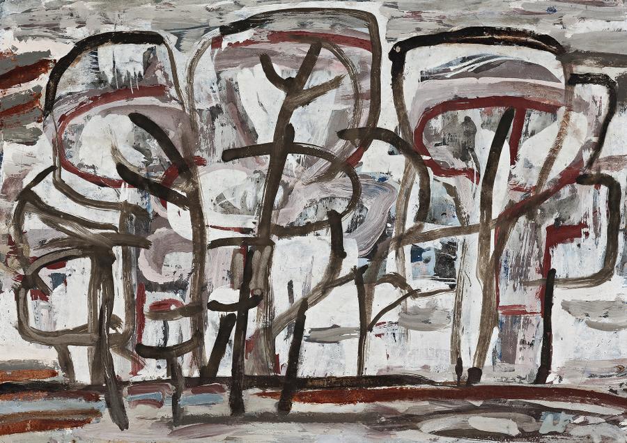 After years of nomadic wanderings, Ian Fairweather finally settled in 1953 on Bribie Island, a scrubby, ragged island north of Brisbane. Building a primitive studio-shack out of driftwood and scrap, he set about 'transform(ing) impressions of his surroundings and memories into complex, layered works.'1 Continuously informed by Chinese art and literature, his painterly marks and lines revealed a deeply responsive and expressive connectedness to his surroundings, noting that 'the Chinese have quite a different idea of painting from us. The movement, the stroke of the hand counts so much for them. They never draw a straight line. And it's the same for me. It's given me a sensitiveness towards line that I didn't have.'2 By the late 1950s, these densely orchestrated paintings were becoming more and more abstract, culminating in a series of pure abstractions from 1958 to 1960.