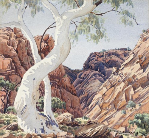 Already an accomplished craftsman producing pokerwork decorated woomeras, boomerangs and wooden plaques, it was after viewing an exhibition of watercolour paintings by Victorian artists Rex Battarbee and John Gardner at the Hermannsburg Mission in 1934 that Albert Namatjira found his calling. Immediately interested in the medium, Namatjira pleaded to be allowed to learn watercolour techniques and his persistence paid off with Rex Battarbee agreeing to Namatjira accompanying him on two month-long expeditions in 1936. With Namatjira as guide, they visited some spectacular locations around the Western MacDonnell Ranges in the vicinity of his homelands. In return for Namatjira's guiding expertise Battarbee taught him his method of landscape watercolour painting. His skill so impressed Battarbee that he noted after only a brief period, 'I felt he had done so well that he had no more to learn from me about colour.'2