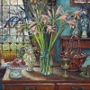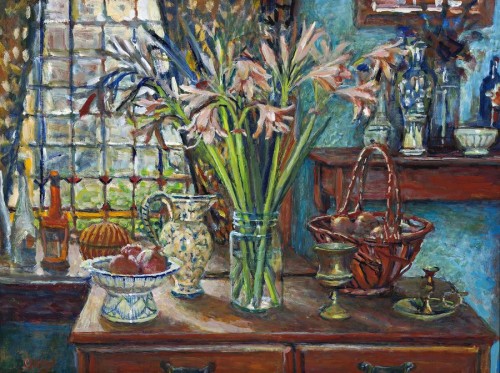 Olley is renowned for her captivating still-life and interior scenes, as each flower and vase is painted with the same deference as she would paint a human figure. Taking centre stage, the lush hippeastrums demonstrate Olley's love for flora, as she herself has expressed: 'I can feel for flowers as I can for people. Painting flowers is almost like painting a portrait. I couldn't care less about them as botanical specimens - in fact I don't know the names of many of the flowers I paint.'2 This is an intimate scene taken from Olley's everyday life, as if we have stumbled into her private domain. It has been said many times that Olley's domestic environment was her great inspiration, as her good friend Barry Humphries describes, 'the house is her studio, and its contents are her subject. Her method - seemingly vagrant - is in reality a sophisticated artistic assembly line from which emerge her vibrant tableaux of inanimate things.'3