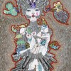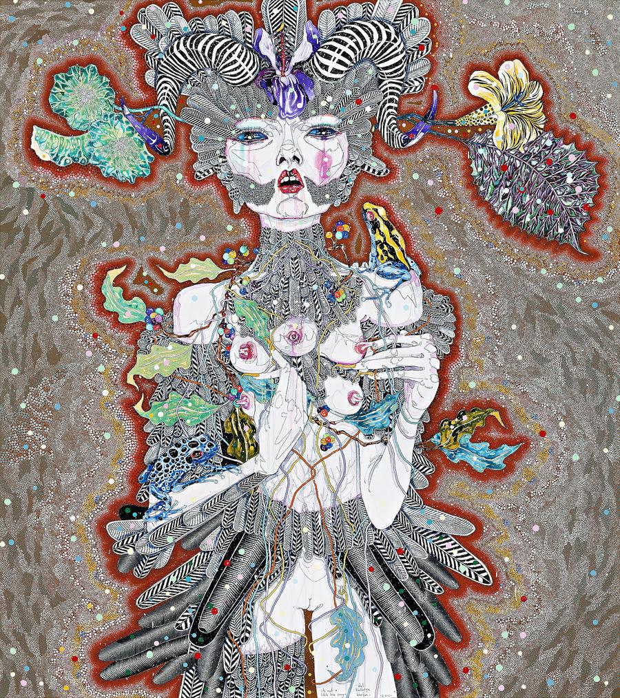 Monumental in scale and painstaking embellishment, it's not a little love song, 2011 is a commanding example of the fantastical, feathered females exhibited to such acclaim in 'satellite fade-out', Barton's inaugural show at Roslyn Oxley9 Gallery, Sydney in 2011. Departing from the multi-panelled, multi-figured compositions of previous years, the artist consciously embarked upon this group of courtly women as an opportunity to explore individual variants within a serial format. Strongly reminiscent of the stiff, imperious females of Renaissance portraiture (specifically, the work of Italian mannerist painter Bronzino) in their upright regal carriage, high intelligent forehead and stern demeanour, Barton's sitters also share affinities with the richly decorative art of Gustav Klimt in the positioning of their hands and shape of their hair (more mane than coiffure, and here featuring a lyrebird's tail), while the large watery eyes and use of bright colour unmistakably evoke the illustrations of Japanese manga comics. For all their sisterly resemblances which suggest a family or tribe, however, each remains distinctly different with her own indelible personality: one appears pensive, another more anxious, yet another ecstatic as her head is tilted and eyes averted.