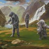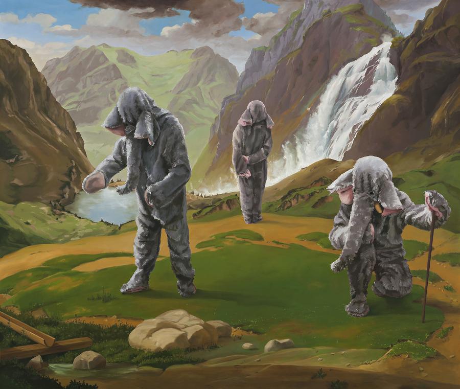 In Just Wait Till Then Becomes Now, 1996, connotations of loss and displacement are continued, with people here dressed in ill-fitting elephant suits plodding around absurdly in a lush green alpine setting. Moreover, that the scene appears so awkward - just a little too stilted, too sublime to be sincere - alludes to the way in which the artist perceives the history of Western art and culture has been manipulated and contrived, as Bush asserts: 'chaps standing in front of the diorama of an alpine scene - all linked together but looking very rigid and artificial - this is how I see the history of art!'3 Derived from the lyrics of the song 'Wasting Time' 1993 by The Judy Bats (an alternative Tennessee rock band active during the late 80s and early 90s), the title of the present work attests not only to Bush's interest in sophisticated quotation from a myriad of diverse sources including music, literature, film, art history, mass media, botany and horticulture. More significantly perhaps, it reveals the artist's deeper conceptual concerns. Like the almost identical composition When I Was Here, I Wanted to Be There, 1994, the work on offer poignantly reminds us of the impossibility of living in the present moment.