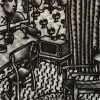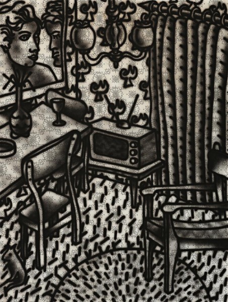 It is not difficult to see why when contemplating this work. The hand of the artist suggests an assuredness and maturity that belied his youthfulness. It is the work of an artist in total control of his language. Every centimetre is utilised to balance what in theory is a chaotic tableaux. It is a clearly obsessive work, as though if any element were removed the entire room would collapse. His fascination with both 1950s and 1960s furnishings - the kind of kitsch detritus that often furnished his early studios - is a prominent element, but so too is his obsession with the faux Rococo and Baroque simulacra that one can still find in Op Shops in Prahran and St. Kilda - the garish light fitting (no doubt fake brass) and dated wine goblet (no doubt fake gold) on the table.