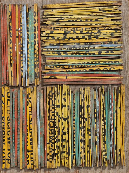 sawn soft drink crates on plywood mounted on board