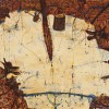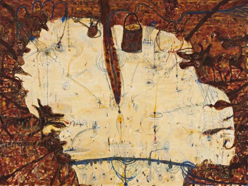 Like the artist Ian Fairweather, who he greatly admired, Olsen was fascinated by Chinese art and literature. With Water Flowing into Lake Eyre, he presents a perfect encapsulation of their interpretation of the void as evoking the concept of 'everything and nothingness', 'a place for contemplation, a vast, engulfing space.'4 In this painting, the vision literally pops and fizzes with life. Set on a highly tilted plane that may be viewed on a macro- and micro- level, the edges teem with life as water skimmers leave arcs on the surface like the trails behind Brett Whiteley's ferries. Dingoes, birds and humans gather by the shore whilst a patterned python bisects the sand as it stretches out to take a drink. 'There's a lot happening in my pictures. I take a multi-perspective approach on the one canvas, I'm down on the ground one moment and up flying the next, or looking sideways or underneath, because that's the way the world is today.'5