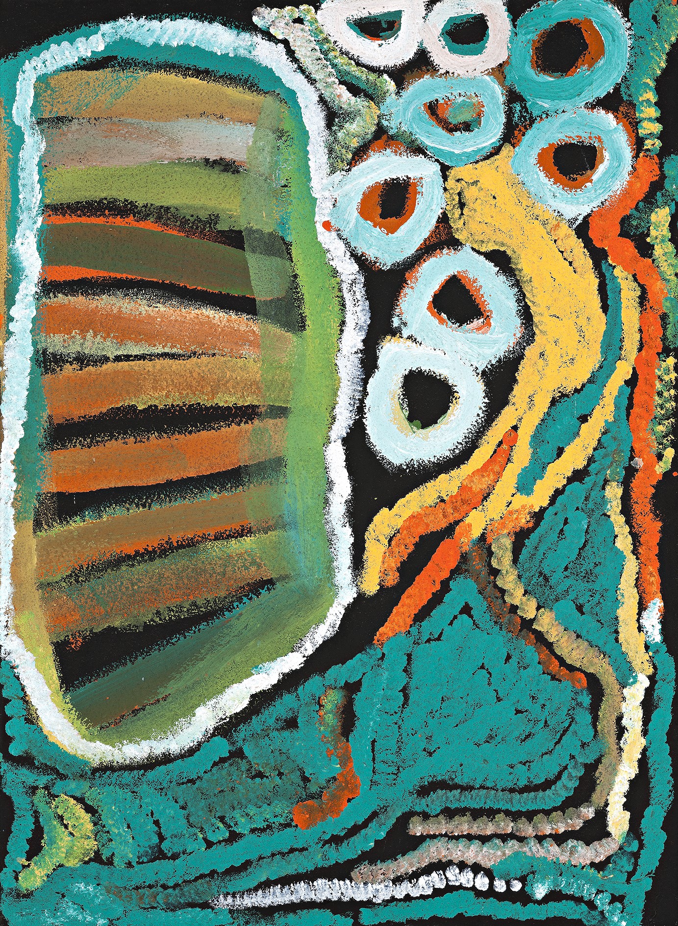 This work is accompanied by a certificate of authenticity from Short St. Gallery, Broome which states: ‘”This place is the birth place of my father’s clan. Our clan is also named Kirriwirri. The is a big warla (mud flat) at this place. This is what this painting is about.” Kirriwirri is in the Great Sandy Desert close to and west of Well 33 on the Canning Stock Route. It is the birth place of Jan and her family. This work shows tali (sand dunes) and jila (living water).’