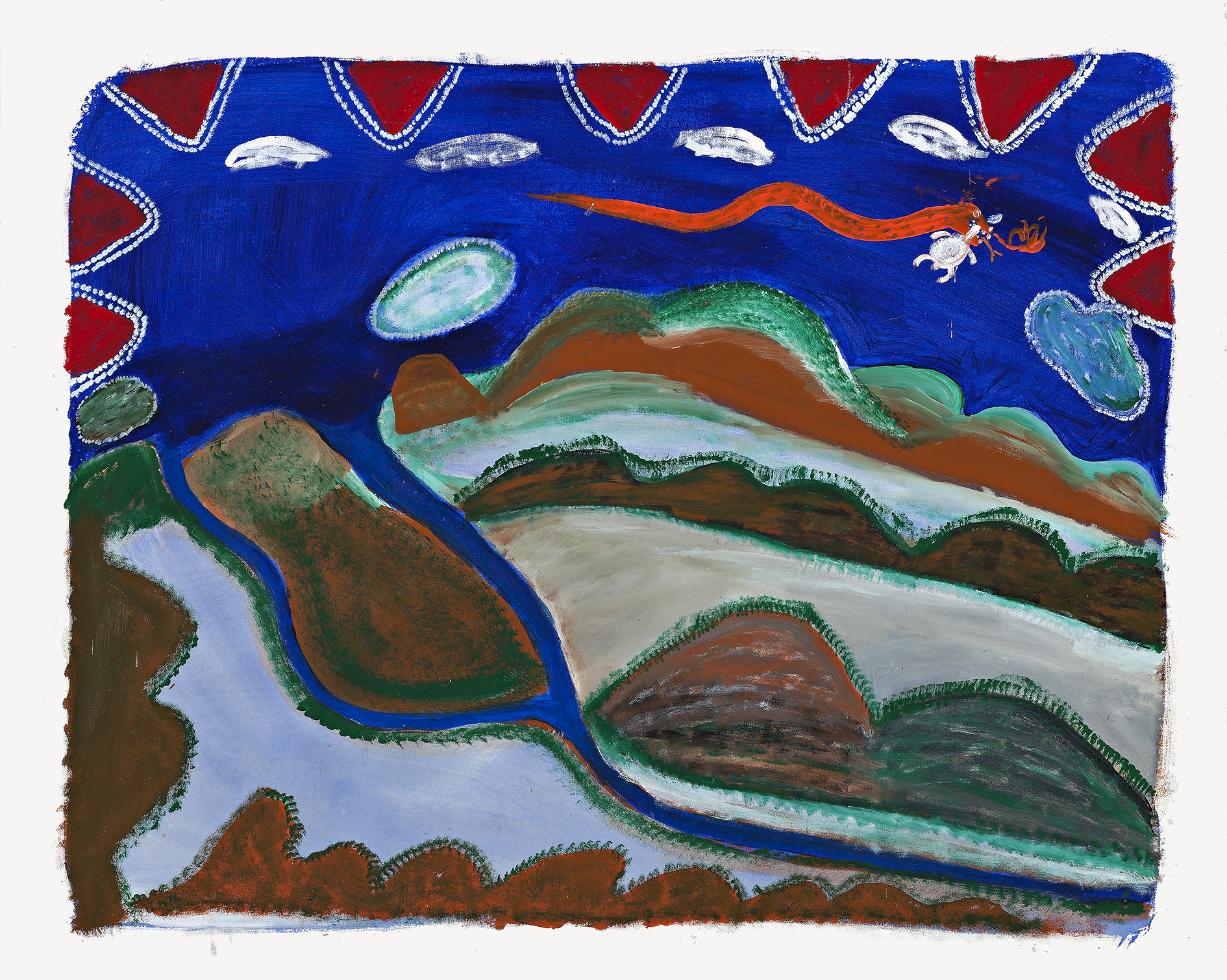 Ginger Riley described his own work as ‘the same, but different.’1 The ‘same’, refers to the constantly explored subject matter and narrative, but each work is varied in presentation, paint and design. The artist’s style is known to be figurative, colourful and mythical, with reoccurring iconographical elements. Riley grew up in the coastal salt-water country of the Mara people in south-eastern Arnhem Land, located in the Northern Territory. His mother’s country served as the basis and inspiration for his work.