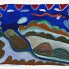 In Limmen Bight Country, 1991 we see the landscape of south-east Arnhem Land with the Limmen Bight River dividing in two, as it flows into the Gulf of Carpentaria. The sea and the sky merge into one and wet season clouds hover at the top of the work. The picture on offer was painted not long after Riley had the opportunity to fly over his country in a light aircraft during a big wet. The lush blue, green and red colours of the work are identical to the landscape after the wet. The two islands of the coast are Beatrice and Maria Islands.