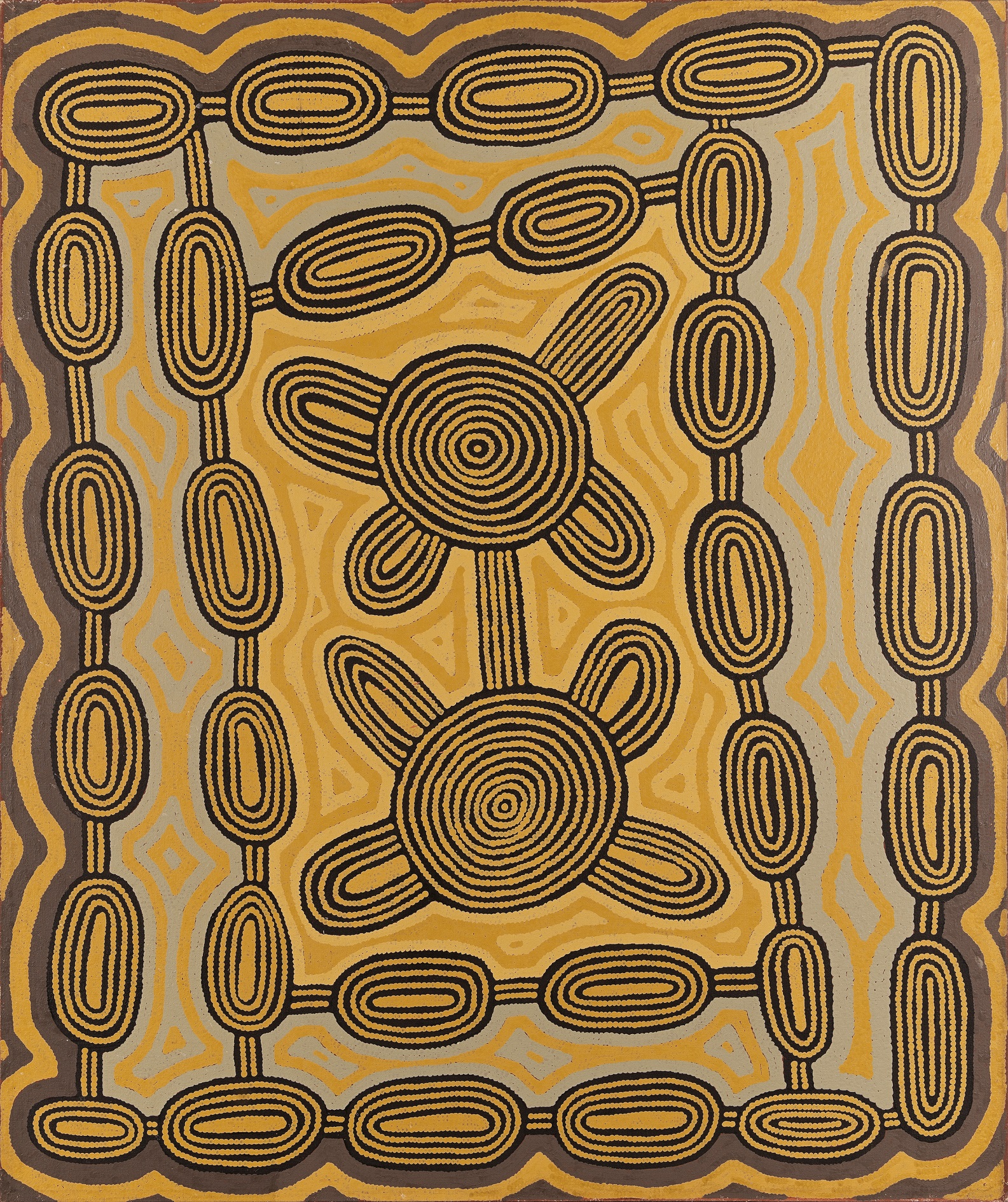 This work is accompanied by a certificate of authenticity from Papunya Tula Artists which states: ‘This painting depicts the Pitjara Dreaming at the site of Tjiterulnga to the west of the Kintore community. This is a rockhole site in ranges to the west of which is a plain where Pitjara grows. This is a small plant which has a long edible tuber (similar to a sweet potato). The oblong shapes at the edges of the work represent the tubers and the central section is the design associated with the ceremonies.’