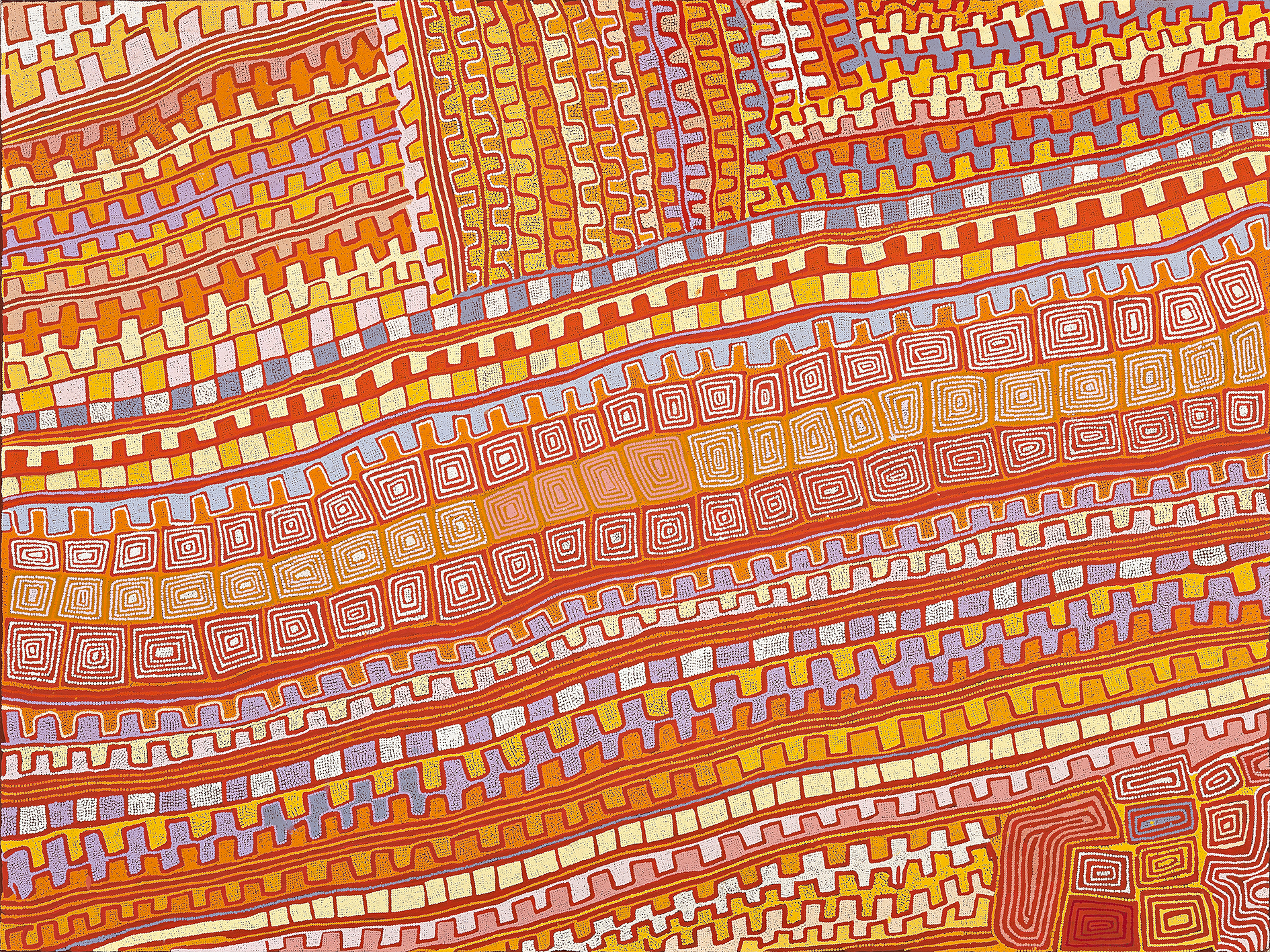 This work is accompanied by a certificate of authenticity from Papunya Tula Artists which states: ‘This painting depicts designs associated with the soakage water site of Puntujtalpa (Jupiter Well), in Western Australia. During ancestral times a large group of Tingari Men camped at this site before travelling south to the lake site of Ngarru. At Ngarru the men gathered the mulyati tree (Acacia jensenii) which, because of its long slender trunk, is used to make spears and digging sticks. The men later continued their journey towards the north east eventually arriving at Wilkinkarra (Lake Mackay). Since events associated with the Tingari Cycle are of a secret nature no further detail was given. Generally, the Tingari are a group of mythical characters of the Dreaming who travelled over vast stretches of the country, performing rituals and creating and shaping particular sites. The Tingari Men were usually followed by Tingari Women and accompanied by novices and their travels and adventures are enshrined in a number of song cycles. These mythologies form part of the teachings of the post initiatory youths today as well as providing explanations for contemporary customs.’