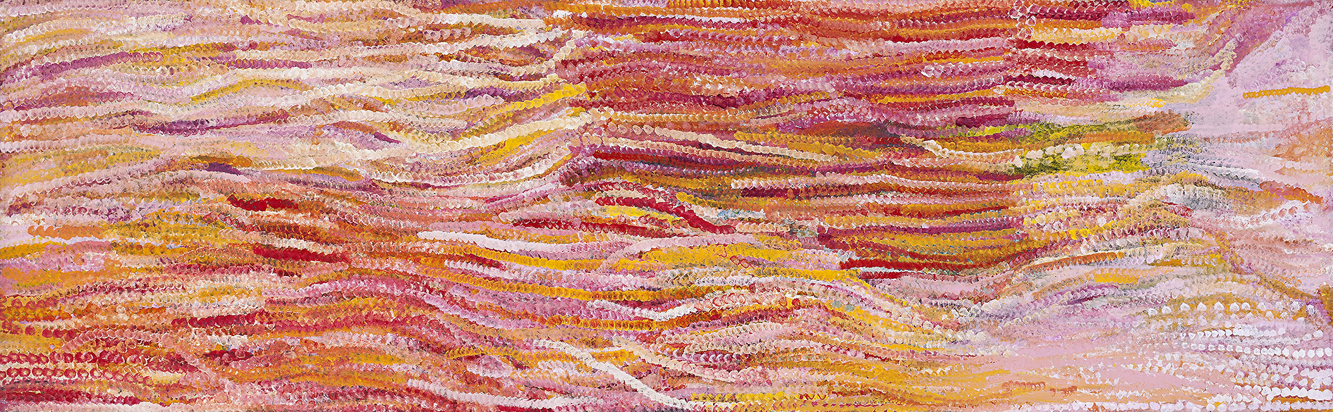 It is difficult to think of another Australian artist who, having started painting so late in life, left such an enduring mark on modern Australian art, and in this masterwork we can begin to understand why. It marks a shift in style in her representation of the wellspring of her experience, namely her Alhalkere home at Utopia in the Eastern Desert, north east of Alice Springs – the landscape and its cycles, the seasons, her Dreamings. In this work connections to symbols and the underlying linear marks of earlier paintings have lost definition. Saturated in colour, Alhalkere, 1994 is a monumental work, explosive in the use of her lexicon. She is immersed in the experience of painting and the interconnectedness of life, landscape and culture. Indeed, when asked about what she paints, she said, ‘Whole lot, that’s all – that’s what I paint, whole lot.’1