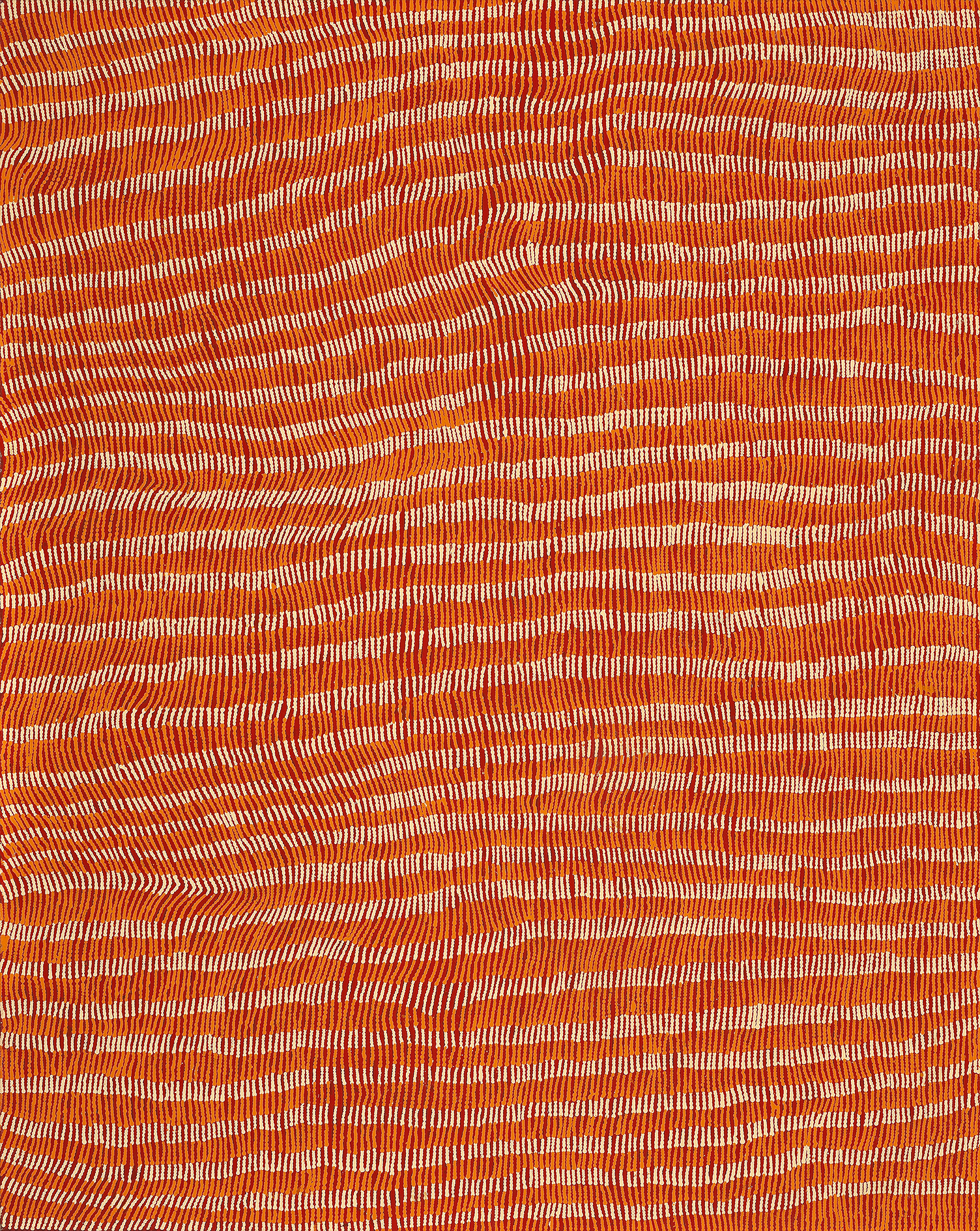 During ancestral times a group of women camped at this site after travelling further west. While at Yunala the women camped beside the rockhole, digging for the edible roots of the bush banana or silky pear vine Marsdenia australis, also known as yunala. The lines in this painting represent both the sandhills surrounding the site and the yunala. The women later continued their travels towards the east, passing through the Kiwirrkura area on their way to Wilkinkarra (Lake Mackay).