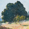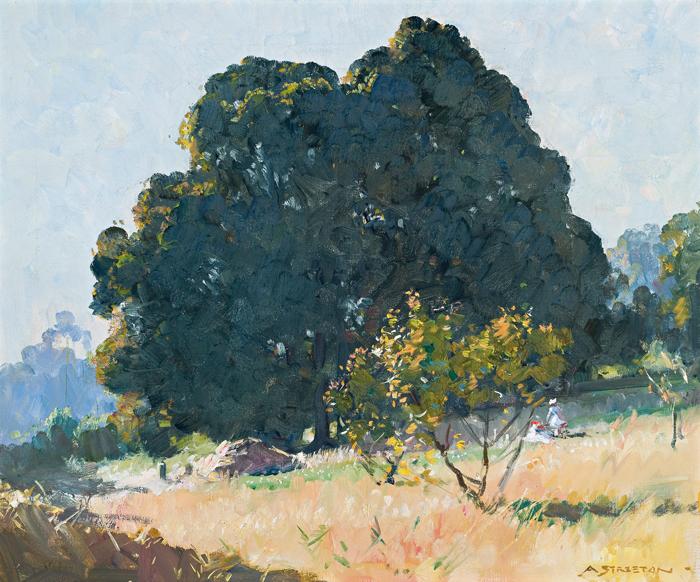 Arthur Streeton's purchase of land at Olinda in the Dandenong Ranges enabled him to turn his attention to his more immediate surrounds, producing paintings inspired by the garden on his property at 'Longacres', as well as the majestic vistas of the surrounding ranges and their valleys. The blackwood tree in this painting grew at Longacres, being one of a number that attracted Streeton to the area in the first place. In 1921 he wrote to his old friend Tom Roberts that he was 'striving to buy' some acres on top of Olinda. The top part is cleared of all except about 10 fine blackwoods, most beautiful trees (and the blossoms, as you know, a soft yellow like pale butter)' and [he added] there's just nice room for a little home, to be built with the blackwoods surrounding it...'1 Living at Olinda from the mid-twenties on, Streeton developed an increasing concern for conservation in the face of destruction of the nearby forests. This led to trees becoming the greater focus of his attention, the blackwoods on his own land, and those gums surviving or destroyed, nearby. Important paintings include Last of the Messmates, 1928 (private collection) with its single standing tree, and the fallen hero, cut and dismembered in A Mountain Side, 1935 (Westpac Banking Corporation). His 1929 solo exhibition at the Fine Art Society's Gallery, Melbourne, included Our Vanishing Forests and Longacre Blackwoods, together with the now numerous paintings of sunflowers, Canterbury Bells, Michaelmas Daisies and other flowers from his Olinda garden. The individual tree as the single or dominant motif is not unique in Streeton's oeuvre. There are many Australian works, several featuring the blackwood, and in Canada in 1923 he painted The Oak, Vancouver Island. Afternoon Light (Blackwood Tree), 1934, however, is special, the noble gum so typical in much of his painting now humanised by its setting within the artist's garden. This is continued through the introduction of the small picnic group to the right, taking advantage of the tree's protection and shelter from the summer heat. Here are shades of the golden summers of youth in days of yore at Heidelberg. Olinda was a haven for Streeton, an Arcadia in his later years, as this painting clearly shows.
