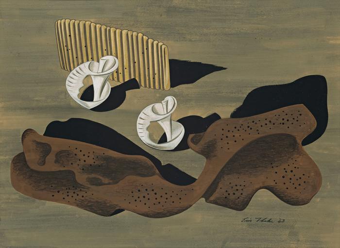 signed and dated lower right: Eric Thake ‘43 signed, dated and inscribed verso: BASS AND FLINDERS / Eric Thake 1943 / Painted from objects / found on Flinders Beach