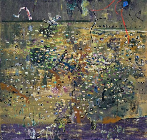 While the presence of fore and far shoreline, and the blue kite with its brilliant trail of red provide figurative elements, Blue Kite, Kew Billabong has the appeal of an abstract painting. Plants and the detritus of the city are transformed by deft dabs and strokes of the brush into a lively surface of colour. Through this fluent working of surface paint within a shallow pictorial field, Blue Kite, Kew Billabong takes on the richness of a tapestry, touched with an Oriental aesthetic and a flavour of the transcendental.
