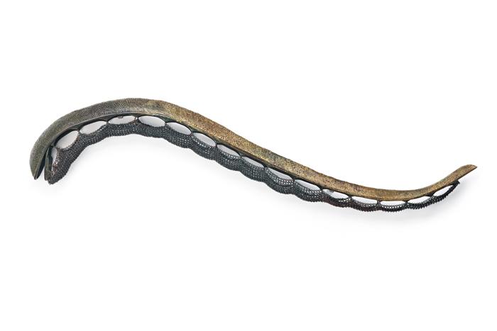 One of Australia's most highly regarded contemporary sculptors, Bronwyn Oliver remains celebrated for her extraordinary ability to produce meticulously articulated works of immense beauty and grace which unite timeless, organic forms of the natural world with the abstract logic of geometry. Simple yet complicated, fragile yet strong, eccentric though at the same time oddly straightforward, her delicately woven copper and bronze assemblages such as Cuirass 1989 universally surprise and inspire - beguiling both the eye and mind through their enigmatic presence. With their tactility and anatomical physicality, such intricately executed forms moreover inevitably elicit a temptation to touch - the sensual, prehistorically-scaled versions of natural phenomena thus reminding us that the world is a corporeal place.