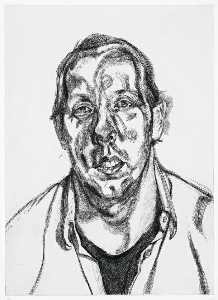 Executed with the painstaking scrutiny that Freud brings to all his subjects, the present etching David Dawson, 1998, nevertheless betrays a certain warmth in the friendly, relaxed disposition of the sitter. A figurative painter and photographer in his own right, Dawson was first introduced to Freud by the Professor of Painting at Royal College, at the beginning of the decade following the completion of his Masters Degree. Although initially employed as a studio assistant, Dawson suggests that today such a description does not really encapsulate his role: 'In the beginning I used to run around, get the paints in, make sure canvases were primed. Now I still do that but then you become more of a friend, more involved in the work. I'm always talking about what I think of his paintings as they're progressing. We have big discussions. We're quite good mates.'4 Significantly, in 2004 Dawson paid homage to Freud with an exhibition of photographs of the artist in his studio at the National Portrait Gallery, London; conversely, Freud too has immortalised his faithful friend in numerous works over the years, including most famously Sunny Morning - Eight Legs, 1997, which features Dawson sprawling naked with his whippet, Eli. Like the best of his intimate portraits of family and friends however, the present is also a portrayal of the artist himself, reflecting echoes and nuances of his own world; as Freud acknowledges 'Painters who use life will eventually reveal a facet of their lives. My work is purely autobiographical.'5