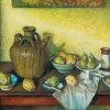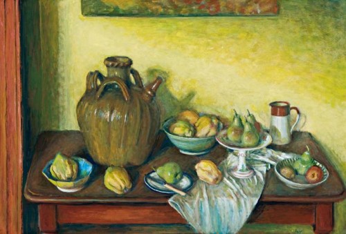 French Oil Jar with Fruits, reflects the informal, personal nature of her art. The specially chosen array of fruits and vessels contrast with the foil of warm red-browns of the cedar tabletop, the edge of the painting within the painting most likely being one of her Bellettes. It is striking in its individual sense of form, sensuality of paint, colour and texture. Pears often appear in her paintings, probably because of their unusual shape and creative potential. Basket of Pears, 1994-95, a related work in a private collection, shows the same cedar table spread with basket and plates of pears, complete with the same cake stand, knife, plate, pear, and drapery.2 Unlike so many other artists, the various fruits and other objects in her paintings have no meaning beyond themselves, for metaphor and symbol are not part of Olley's art. Her matter of fact, direct approach is summed up in a comment she made in a 1984 interview for Vogue Living. 'I never arrange things. I just put them down and don't move them.'3 French Oil Jar with Fruits was painted the year following her highly successful retrospective exhibition at the Art Gallery of New South Wales.