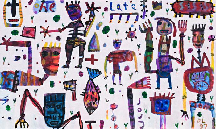 With an engaging personality and strong character, Larwill has a passionate commitment to painting, blended with a touch of the larrikin and maverick, his interest in street art and graffiti coming out in his bold and cheeky imagery. As Ashley Crawford observed, 'His stance, like his work, is deliberately naive and simplistic. Yet Larwill is no fool: his career has been a careful balancing act between public clown and careerist.'2 Early influences included the CoBrA group, especially Karel Appel and Asgar Jorn, and Jean Dubuffet of Art Brut, together with the colour and 'all over' design of traditional kilim rugs. Experiences gained from visits to locations as diverse as the Northern Territory and New were also influential. Larwill's art is often highly autobiographical. Personal narrative combined with strong visual appeal comes to the fore in Never be Late and other 1997 paintings such as Tanya goes to Melbourne - a farewell diptych to his erstwhile partner, the painter and sculptor Tanya Hoddinott. In addition to his engaging sense of colour, a feature of his art is the absence of a central image or single focus, his broad canvases populated by animated figures of people, dogs, snakes, trees and fish (Larwill loves fishing.) They are invariably things familiar to him. In his more political works he adds a keen social conscience, and in others he celebrates the joyous side of life - friendships, footy, and dogs.