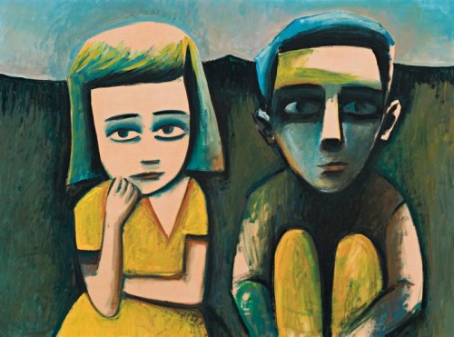 Charles Blackman's paintings reveal an extraordinary understanding of childhood and children, Children in a Landscape being a fine example from a particularly rich period in his art. Pensive and wide-eyed, they look directly out of the picture, but their presentation suggests that their thoughts are elsewhere. As images of isolation emphasised by the emptiness of their surroundings, their vulnerability is compounded by the utter stillness if not timelessness of the setting. If melancholy touches the face of the young girl, the boy is more direct in his unblinking gaze. Appearances, however, are merely the starting point for Blackman's art of ideas, the poignant image the doorway to other things. Judith Wright summed up his art perfectly. 'His painting is not the world of things, but of the world of our experience of them, in which they are changed from things to meanings.'1