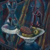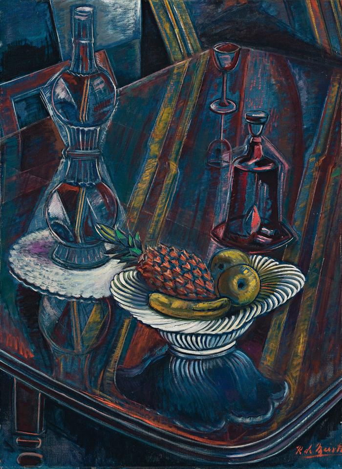 Roy de Maistre's gifted sense of colour came to the fore in his early work in Sydney, especially through his interest in the relationship between colour and music. He also experimented with abstraction, as in the colourful Rhythmic Composition in Yellow Green Minor, 1919, in the collection of the Art Gallery of New South Wales. Eventually settling in England, de Maistre concentrated on painting still life and religious subjects, together with interiors, figure compositions, and the occasional portrait. Drawing on both figuration and abstraction, his paintings inclined towards a form of Cubism in which representation underwent a geometrical transformation. Sufficient realism remained for ready identification, while the eye can delight in the new manner in which the forms are realised. This is delightfully so with Still Life with Bottle and Fruit. Here, as in so much of his mature work, the main dialogue is between the illusion of form and flatness. Ian McLean, writing about a related 1946 painting, Studio Still Life with Lamp, described it thus: 'The latter work is a studio interior in which de Maistre has employed a flattened cubist space but left the objects as solid forms rather than as ones penetrated by spatial planes.' He added, 'de Maistre's depiction of the relationship between objects and space in this work stems more directly from Cézanne than from Picasso and Braque.'1